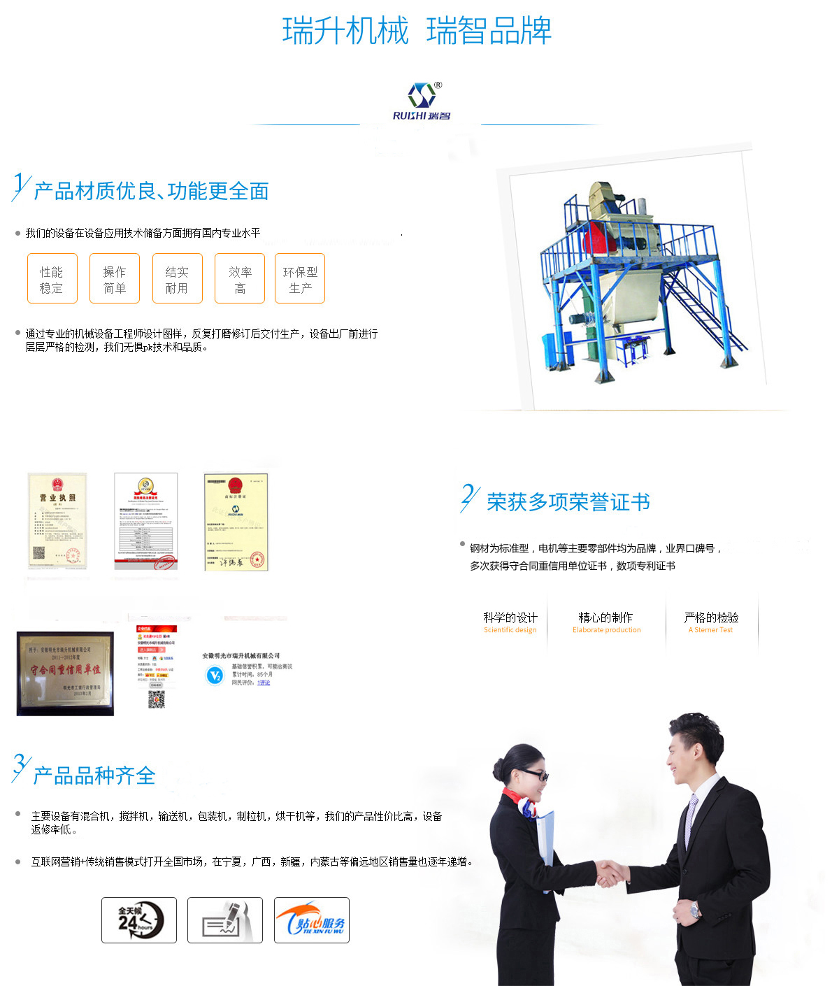 安徽瑞升機(jī)械制造有限公司坐落在明光市工業(yè)園區(qū),本公司產(chǎn)品主要用于粉料物質(zhì),顆粒物質(zhì)的混合、攪拌、輸送、包裝的自動(dòng)化生產(chǎn)設(shè)備。工廠占地面積為1萬多平方現(xiàn)有6000平方米的生產(chǎn)車間和各類加工檢測(cè)設(shè)備,具備產(chǎn)品開發(fā)、研制、設(shè)計(jì)、生產(chǎn)、試驗(yàn)、倉儲(chǔ)運(yùn)輸?shù)饶芰Γ梢陨a(chǎn)多種規(guī)格、多種非標(biāo)定制的產(chǎn)品,并有多項(xiàng)技術(shù)獲得國家專利,擁有自主進(jìn)出口權(quán),公司憑借優(yōu)良的技術(shù)、先進(jìn)的工藝和科學(xué)的管理理念,所生產(chǎn)的產(chǎn)品已暢銷全國各地,部分產(chǎn)品已進(jìn)入馬耳他、印度尼西亞、韓國、羅馬尼亞、沙特阿拉伯、馬來西亞、印度、巴基斯坦、等國家和地區(qū),受到國內(nèi)外客戶的高度認(rèn)可和信賴。 本公司獲得守合同重信用單位證書,對(duì)原材料的采購極為細(xì)致,鋼材為標(biāo)準(zhǔn)型,電機(jī)等主要零部件均為品牌,數(shù)項(xiàng)專利證書。技術(shù)方面我司擁有一支國內(nèi)的技術(shù)和管理團(tuán)隊(duì),在機(jī)械設(shè)備應(yīng)用...公司資質(zhì)榮譽(yù)